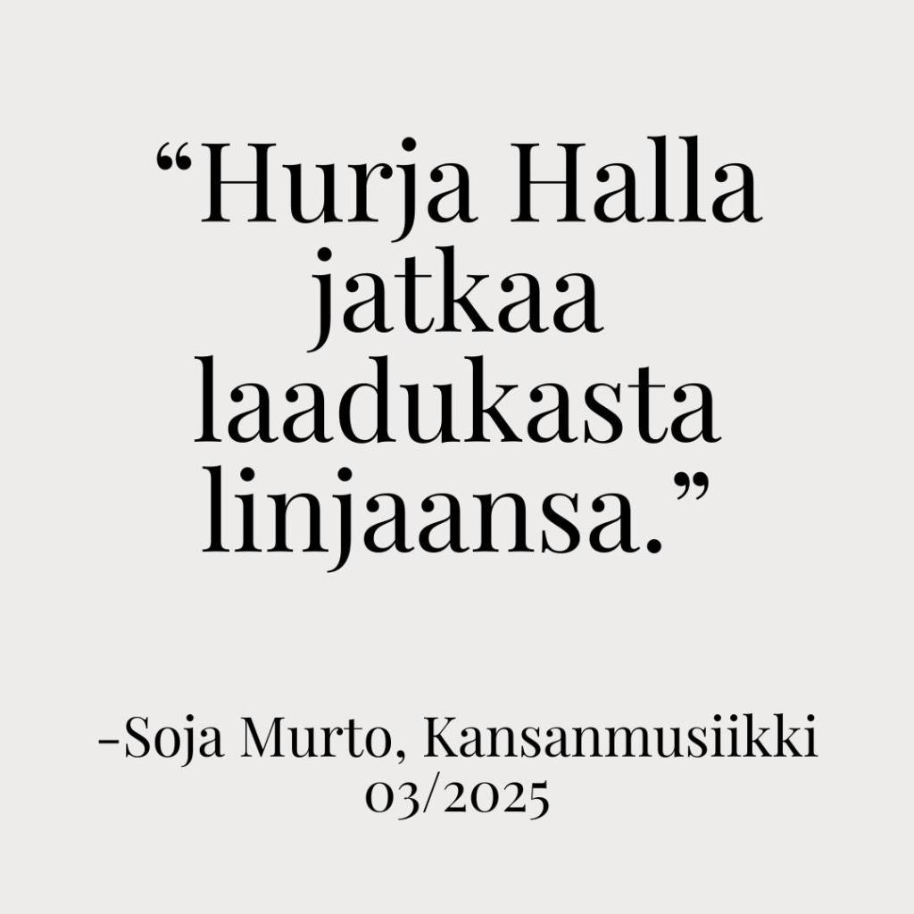 ”Hurja Halla jatkaa laadukasta linjaansa. Eve Pietarisen liittyminen yhtyeeseen on tuonut ennestään sävykkääseen musiikkiin lisää tasoja ja syvykkyyttä. Trion vahvuus on yhteen soittamisessa ja laulamisessa sekä vahvoja mielikuvia luovissa sävellyksissä. Yhtä tradibiisiä lukuun ottamatta kappaleet ovat yhtyeen jäsenten kunniakkaasti säveltämiä.